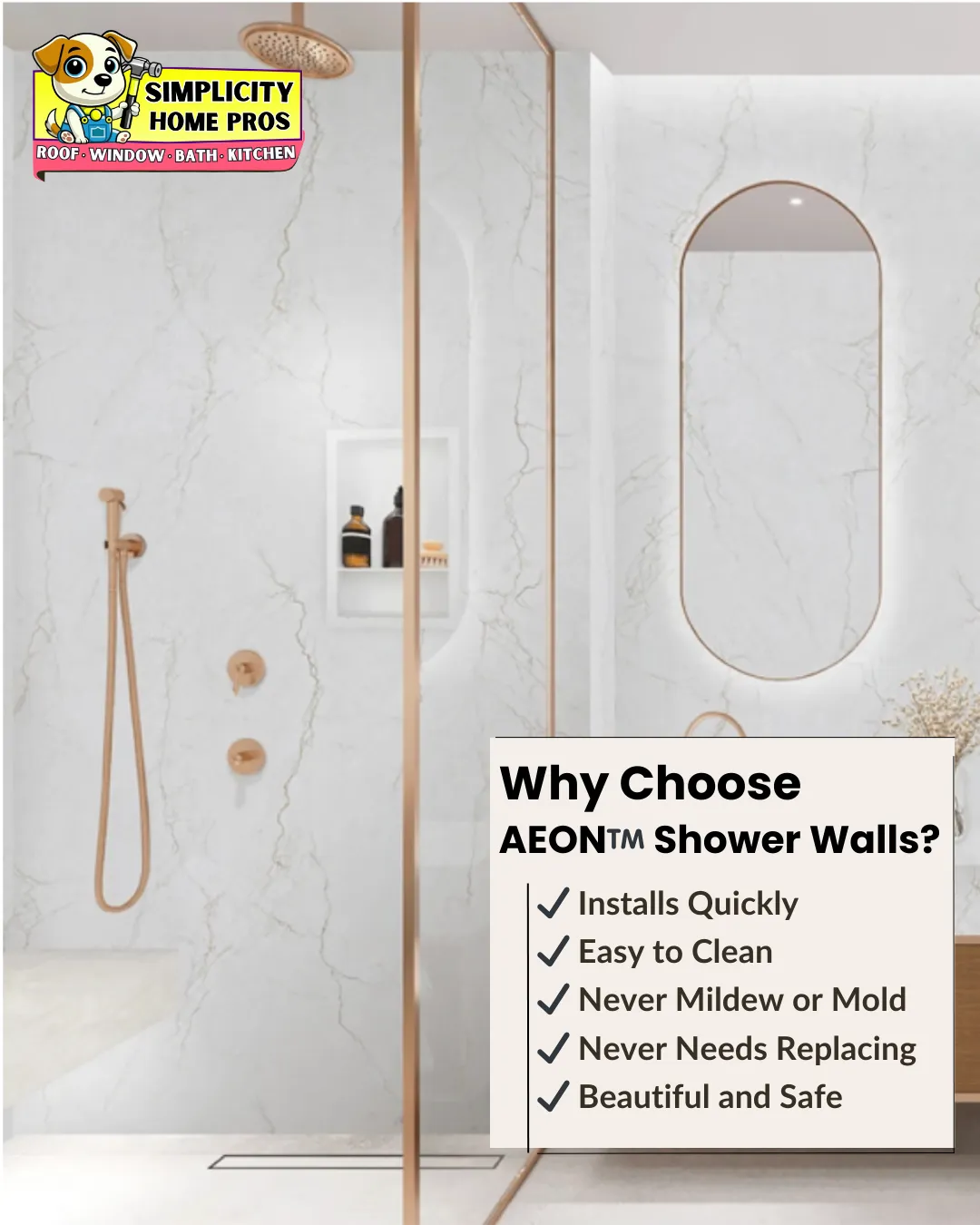 AEON™ Tech Walls are award-winning shower panels recognized for their durability, beauty, and industry-leading technology. Engineered under extreme heat and pressure, they feature scratch resistance, antimicrobial protection, and a Lifetime Product Guarantee.